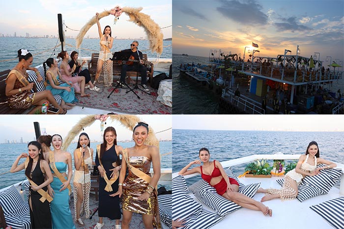 ![]() หลังร่วมรับประทานอาหารเที่ยงสุดพิเศษที่ร้าน Fat Coco Seafood Club เมืองพัทยา จังหวัดชลบุรี ตามคอนเซ็ปต์ “กินหรู อยู่สบาย สไตล์แกรนด์” นางงามเปลี่ยนชุด ลงเรือสปีดโบ๊ท ล่องทะเลไปเที่ยวเกาะล้าน แวะ Rimtalay Resort Koh Larn และคาเฟ่ส่วนตัวสุดชิคอย่าง INDIGO Café ท้าลมห่มแดดถ่ายภาพกันสวยฉ่ำ ปิดท้ายวันด้วยดินเนอร์หรูที่ Tappia Floating Cafe Pattaya ชมพระอาทิตย์ตกดินที่สวยงามตามแบบฉบับ Amazing Thailand