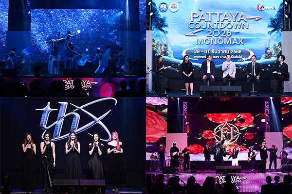 ![]() โดยจัดงานแถลงข่าวงาน “PATTAYA COUNTDOWN 2026 MONOMAX” (พัทยา เคานต์ดาวน์ 2026 โมโนแมกซ์) อย่างเป็นทางการ ณ สเตจ 1 โมโน สตูดิโอ ถนนชัยพฤกษ์ จังหวัดนนทบุรี ใน วันพุธที่ 3 ธันวาคม 2568 เวลา 13.00-15.00 น. เริ่มต้นงานด้วยการแสดงเปิดเวทีด้วยภาพ “ท้องทะเลไทย” อันอ่อนโยนและกว้างใหญ่ เปรียบดังพระเมตตาอันหาที่สุดมิได้ ของ สมเด็จพระนางเจ้าสิริกิติ์ พระบรมราชินีนาถ พระบรมราชชนนีพันปีหลวง ผู้ทรงดูแลผืนแผ่นดินและผืนน้ำไทย เสมือนมารดาแห่งธรรมชาติเคลื่อนไหวราวระลอกคลื่นสื่อถึง “Ocean of Remembrance” มหาสมุทรแห่งความทรงจำที่มีชีวิต” ที่เจริญงอกงามได้ด้วยพระราชกรณียกิจด้านการอนุรักษ์ทรัพยากรทางทะเล สื่อถึงความสงบ ความรัก ความงดงาม และ ความเมตตาเหนือกาลเวลา พร้อมทั้งโชว์สุดพิเศษ จากตัวแทนศิลปิน 2 แนว 2 สไตล์ กับศิลปินเกิร์ลกรุป วง ‘THX’ หยิบเพลง เหมือนเคย - Boyd Kosiyabong และ 9 นาฬิกา - SPF มาคัฟเวอร์ในสไตล์ 5 สาว ‘THX’ และ ‘F.HERO’ ที่จัดเต็มเมดเลย์เพลงแดนซ์มาวอมสเต็ปให้ได้โยกกันทั้งสตูดิโอ โดยไม่ลืมหยิบเพลงฮิต กุหลาบ (KULARB) มามอบความสนุกอย่างครบรส อุ่นเครื่องบนเวทีแบบจัดเต็มความมันส์ พร้อมด้วย ศิลปินเกิร์ลกรุป วง VIIS มาร่วมงานแถลงข่าว เพื่อการันตีงานเฉลิมฉลองส่งท้ายปีเก่าต้อนรับปีใหม่ด้วยกัน