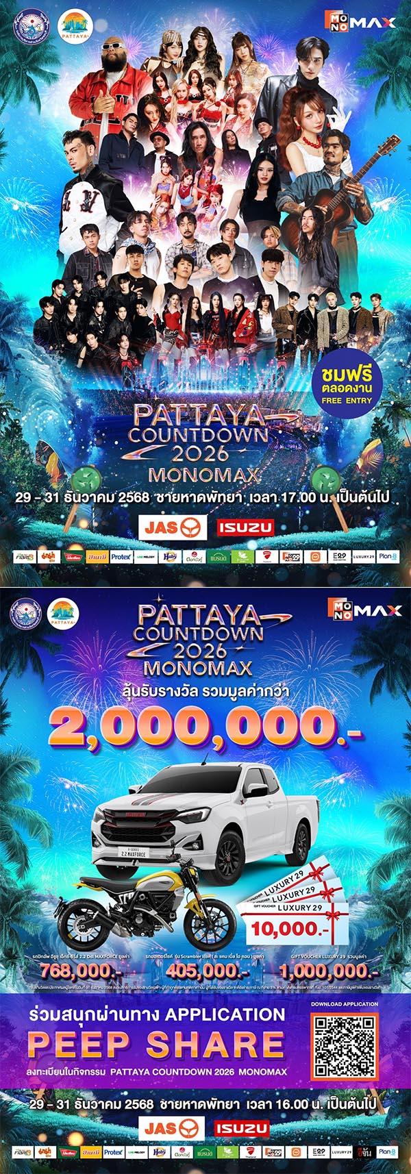 ลำดับถัดมาคณะผู้จัดงาน คุณปรเมศวร์ งามพิเชษฐ์ นายกเมืองพัทยา, คุณพนธกร ใคร่ครวญ รองนายกองค์การบริหารส่วนจังหวัดชลุบรี, คุณนวมินทร์ ประสพเนตร ประธานเจ้าหน้าที่บริหาร บริษัท โมโน เน็กซ์ จำกัด (มหาชน), คุณสรรวรส พุทธเจริญลาภ ผู้จัดการฝ่ายสื่อสารการตลาดรถเล็ก บริษัท ตรีเพชรอีซูซุเซลส์ จำกัด ร่วมพูดคุยถึงการจัดงานเคานต์ดาวน์สุดยิ่งใหญ่ในปีนี้อย่างเป็นทางการ ในการเนรมิตบรรยากาศริมชายหาดพัทยา ที่เต็มไปด้วยสีสันความบันเทิงเต็มรูปแบบ ท่ามกลางการแสดงคอนเสิร์ตสุดมันส์จากศิลปินดังระดับประเทศกว่าร้อยชีวิต การแสดงพลุไฟและโดรนสุดยิ่งใหญ่ และชวนทุก ๆ คน พบกับตัวแทนร้านค้าดารา คุณนก จริยา แอนโฟเน่ และคุณจุ๊บแจง วิมลพันธ์ ชาลีจังหาญ ที่มาร่วมงานแถลงข่าว พร้อมทั้งร้านค้าดาราชื่อดังภายในงานมากมายในวันงาน ให้ชาวพัทยาและจังหวัดใกล้เคียงได้เต็มไปด้วยความสุขสนุกอย่างไร้ขีดจำกัด ชมฟรีตลอดงาน ถ่ายทอดสดผ่านทางสถานี โทรทัศน์ช่อง MONO29 ในคืนวันที่ 31 ธันวาคม 2568 นอกจากนี้ ยังมีรางวัลใหญ่ รถปิกอัพ อีซูซุ เอ็กซ์-ซีรี่ส์ 2.2 Ddi MAXFORCE มูลค่าราคา 768,000 บาท, รถมอเตอร์ไซค์ BigBike Ducati รุ่น Scrambler Icon มูลค่าราคา 405,000 บาท, Gift Voucher Luxury 29 มูลค่า 1,000,000 บาท และร่วมลุ้นรางวัลอื่น ๆ อีกมากมาย มูลค่ากว่า 2 ล้านบาท เพียงดาวน์โหลด APPLICATION “PEEP SHARE ” พร้อมกรอกข้อมูล และกดลงทะเบียน เพื่อเข้าร่วมงาน และลุ้นรับรางวัลที่ทางผู้จัดงานเตรียมมอบให้เป็นของขวัญปีใหม่ ให้กับผู้เข้าร่วมงาน ![]() คุณปรเมศวร์ งามพิเชษฐ์ นายกเมืองพัทยา กล่าวว่า “งานพัทยาเคานต์ดาวน์ เป็นกิจกรรมหลักที่อยู่ในปฏิทิน การท่องเที่ยวเมืองพัทยาและองค์การบริหารส่วนจังหวัดชลบุรีจัดขึ้นอย่างต่อเนื่องเป็นเวลาหลายปีที่ผ่านมา โดยได้รับความสนับสนุนจากหน่วยงานภาครัฐและเอกชนร่วมกันจัดกิจกรรมดี ๆ เพื่อส่งเสริมอุตสาหกรรมการท่องเที่ยวของพัทยา และพื้นที่โดยรอบ และร่วมกันพัฒนาการท่องเที่ยวอย่างยั่งยืน โดยในปีนี้เรายังคงจัดงานบริเวณชายหาดพัทยา มีเวที แสง สี เสียง ที่จัดอย่างยิ่งใหญ่เช่นเคย กับการระดมพลศิลปินชั้นนำมาร่วมมอบความสุข ตลอด 3 วัน 3 คืน ซึ่งในการจัดงานนี้ยังเตรียมมาตรการรักษาความปลอดภัยอย่างเต็มกำลัง เพื่อดูแลนักท่องเที่ยวทุกคนให้ได้เฉลิมฉลองอย่างมีความสุข ตลอด 3 วัน ขอชวนทุกคนมาร่วมสนุกด้วยกัน”