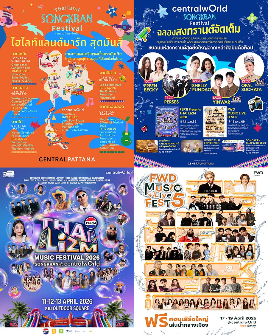 - 11–13 เม.ย. 69 เซ็นทรัลเวิลด์ No.1 แลนด์มาร์กสงกรานต์ระดับโลกใจกลางกรุงเทพฯ กับ PEPSI Presents THAI LIZM 2026 สงกรานต์ยกหาดสาดคลื่นปาร์ตี้ ความมันส์แบบใหม่ใจกลางกรุงเทพที่จะทำให้คุณ “เปียก แบบ ป๊อปๆ” พบกับศิลปินระดับท็อปของประเทศและดีเจตัวตึงอีกเพียบ อาทิ JOEYBOY, ไททศมิตร, สิงโต นำโชค, PERSES, ลำไย ไหทองคำ, PROXIE, ALALA และอีกมากมาย